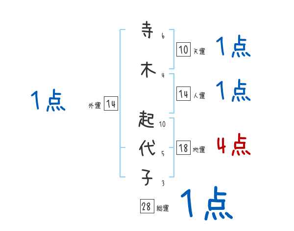 天運![]() | 寺木起代子さんの天運は10画の1つ星!不安を感じやすい傾向。ストレスを抱えないように注意しましょう。 家系が持つ宿命的な運勢を表します。祖先から受け継いだ苗字ですので自分の力が及びません。家柄を象徴します。 |