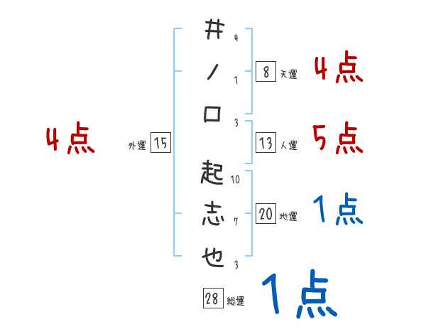 総運![]() | 井ノ口起志也さんの総運は28画の1つ星!家庭環境に注意。スポーツで活躍できる能力があるかも。 あなたの人生を表す1番重要な運勢です。生涯を通じて影響する総合運となり、主に50歳以降の晩年期に影響を及ぼします。 |