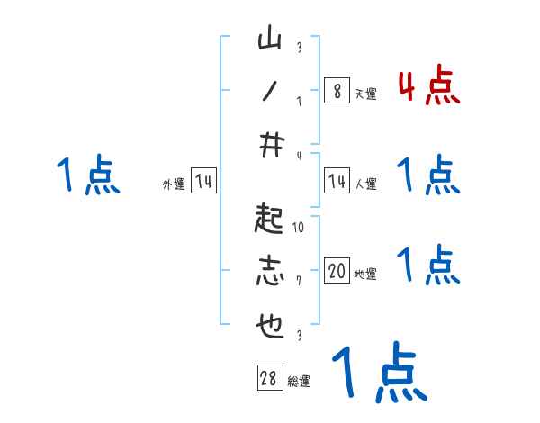 総運![]() | 山ノ井起志也さんの総運は28画の1つ星!家庭環境に注意。スポーツで活躍できる能力があるかも。 あなたの人生を表す1番重要な運勢です。生涯を通じて影響する総合運となり、主に50歳以降の晩年期に影響を及ぼします。 |