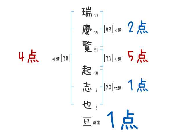 天運![]() | 瑞慶覧起志也さんの天運は49画の2つ星!不安定な性格で明暗がある人生。周りの人には支援されやすい。 家系が持つ宿命的な運勢を表します。祖先から受け継いだ苗字ですので自分の力が及びません。家柄を象徴します。 |