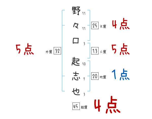 外運![]() | 野々口起志也さんの外運は32画の5つ星!柔軟性があり成功する。チャンスが多く金運が良い。 生活面を象徴する運勢です。外部から受ける影響力を表し、結婚運、家庭運や職場、環境への順応性を表します。 |