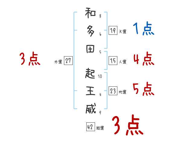 総運![]() | 和多田起王威さんの総運は42画の3つ星!病気に注意。多芸であるが消極的でおとなしい。 あなたの人生を表す1番重要な運勢です。生涯を通じて影響する総合運となり、主に50歳以降の晩年期に影響を及ぼします。 |