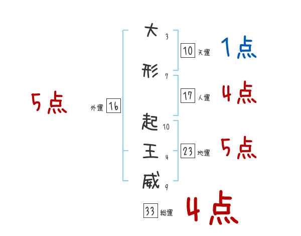 外運![]() | 大形起王威さんの外運は16画の5つ星!人望が厚く大きく発展する。逆転成功が見える。 生活面を象徴する運勢です。外部から受ける影響力を表し、結婚運、家庭運や職場、環境への順応性を表します。 |