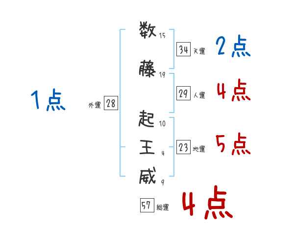 天運![]() | 数藤起王威さんの天運は34画の2つ星!独創性に優れるが、自尊心が強く災難に注意しましょう。 家系が持つ宿命的な運勢を表します。祖先から受け継いだ苗字ですので自分の力が及びません。家柄を象徴します。 |