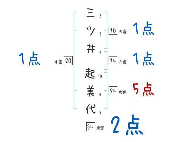 天運![]() | 三ツ井起美代さんの天運は10画の1つ星!不安を感じやすい傾向。ストレスを抱えないように注意しましょう。 家系が持つ宿命的な運勢を表します。祖先から受け継いだ苗字ですので自分の力が及びません。家柄を象徴します。 |