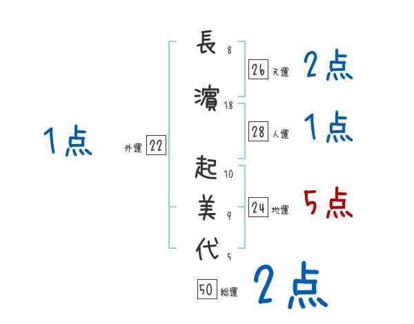 人運![]() | 長濵起美代さんの人運は28画の1つ星!家庭環境に注意。スポーツで活躍できる能力があるかも。 性格や才能などを表す2番目に重要な運勢です。人間関係や協調性、社会的な成功に影響します。主に20歳から50歳ぐらいまでの中年期の運勢を表します。 |
