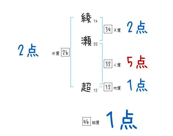 人運![]() | 綾瀬超さんの人運は32画の5つ星!柔軟性があり成功する。チャンスが多く金運が良い。 性格や才能などを表す2番目に重要な運勢です。人間関係や協調性、社会的な成功に影響します。主に20歳から50歳ぐらいまでの中年期の運勢を表します。 |