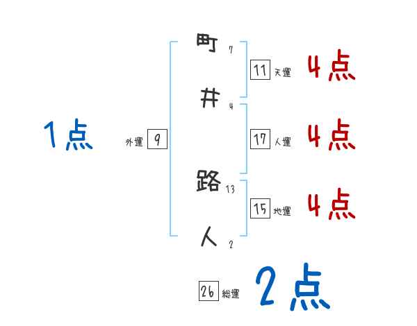 天運![]() | 町井路人さんの天運は11画の4つ星!着実に富や地位を得る幸運な人生。 家系が持つ宿命的な運勢を表します。祖先から受け継いだ苗字ですので自分の力が及びません。家柄を象徴します。 |