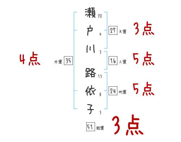 外運![]() | 瀬戸川路依子さんの外運は35画の4つ星!温厚な性格で感受性が高い。穏和な性格で人望が厚い。 生活面を象徴する運勢です。外部から受ける影響力を表し、結婚運、家庭運や職場、環境への順応性を表します。 |