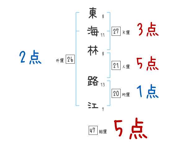 人運![]() | 東海林路江さんの人運は21画の5つ星!統率力がある。独立し成功する。名誉を手に入れる。 性格や才能などを表す2番目に重要な運勢です。人間関係や協調性、社会的な成功に影響します。主に20歳から50歳ぐらいまでの中年期の運勢を表します。 |