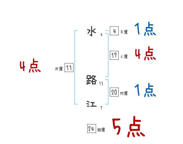 天運![]() | 水路江さんの天運は4画の1つ星!感情が不安定で苦労するかも。周囲との協調を心掛けましょう。 家系が持つ宿命的な運勢を表します。祖先から受け継いだ苗字ですので自分の力が及びません。家柄を象徴します。 |