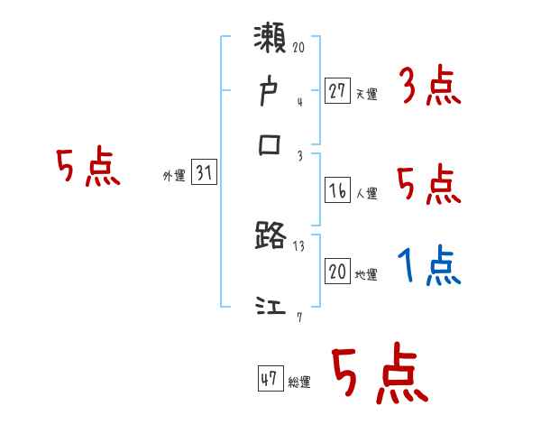 人運![]() | 瀬戸口路江さんの人運は16画の5つ星!人望が厚く大きく発展する。逆転成功が見える。 性格や才能などを表す2番目に重要な運勢です。人間関係や協調性、社会的な成功に影響します。主に20歳から50歳ぐらいまでの中年期の運勢を表します。 |