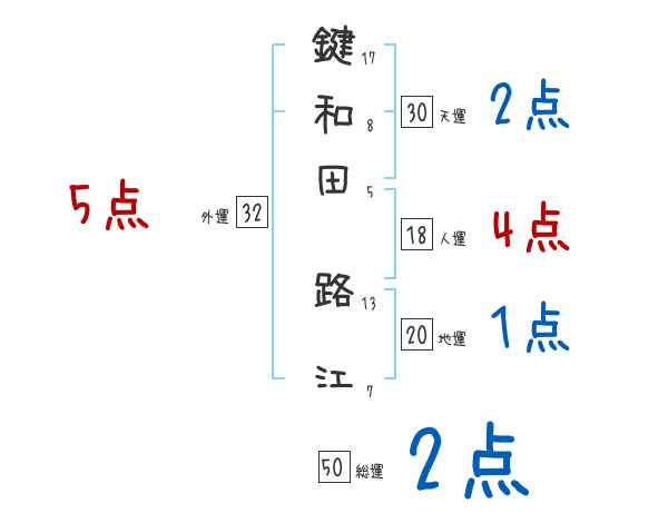 外運![]() | 鍵和田路江さんの外運は32画の5つ星!柔軟性があり成功する。チャンスが多く金運が良い。 生活面を象徴する運勢です。外部から受ける影響力を表し、結婚運、家庭運や職場、環境への順応性を表します。 |