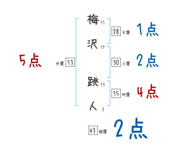 天運![]() | 梅沢跳人さんの天運は28画の1つ星!家庭環境に注意。スポーツで活躍できる能力があるかも。 家系が持つ宿命的な運勢を表します。祖先から受け継いだ苗字ですので自分の力が及びません。家柄を象徴します。 |