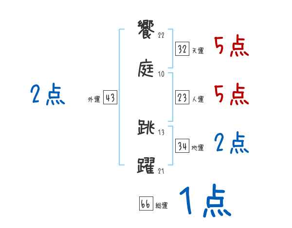 天運![]() | 饗庭跳躍さんの天運は32画の5つ星!柔軟性があり成功する。チャンスが多く金運が良い。 家系が持つ宿命的な運勢を表します。祖先から受け継いだ苗字ですので自分の力が及びません。家柄を象徴します。 |