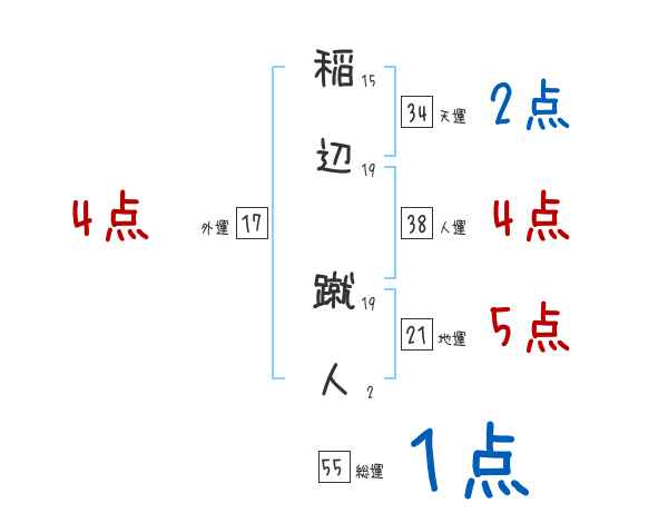 外運![]() | 稲辺蹴人さんの外運は17画の4つ星!積極的な行動力。地位を気づき財産を手に入れる。純粋な心と直感力。 生活面を象徴する運勢です。外部から受ける影響力を表し、結婚運、家庭運や職場、環境への順応性を表します。 |