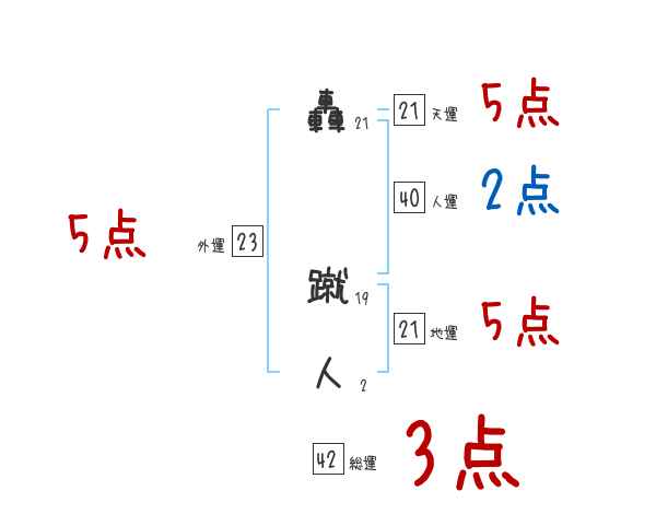 外運![]() | 轟蹴人さんの外運は23画の5つ星!想像力に優れ活力がある。一代で成功し名誉を手に入れる。 生活面を象徴する運勢です。外部から受ける影響力を表し、結婚運、家庭運や職場、環境への順応性を表します。 |