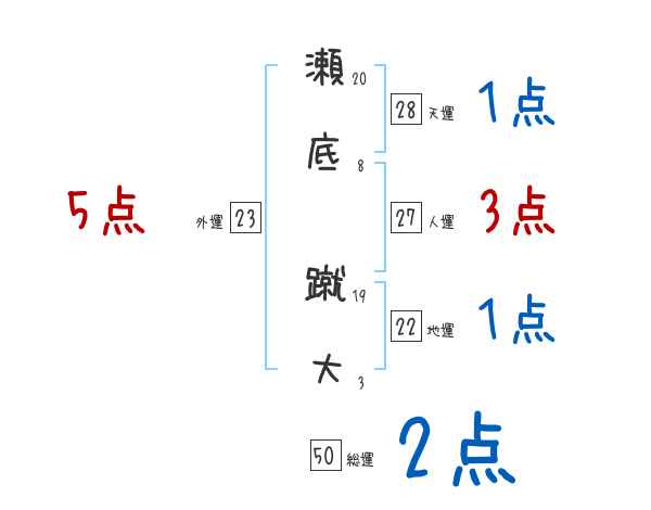 天運![]() | 瀬底蹴大さんの天運は28画の1つ星!家庭環境に注意。スポーツで活躍できる能力があるかも。 家系が持つ宿命的な運勢を表します。祖先から受け継いだ苗字ですので自分の力が及びません。家柄を象徴します。 |