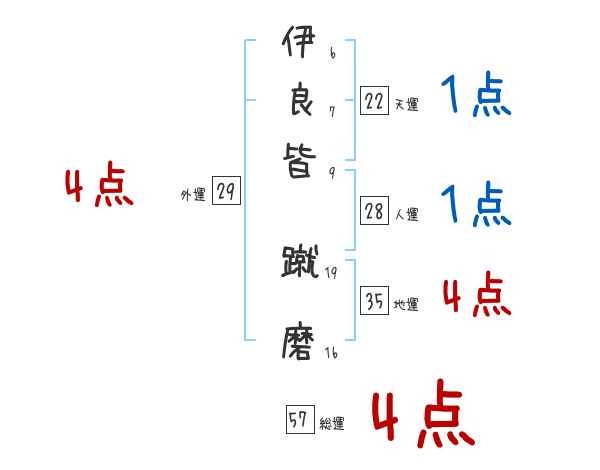 総運![]() | 伊良皆蹴磨さんの総運は57画の4つ星!向上心があり人望がある。地位を得る。 あなたの人生を表す1番重要な運勢です。生涯を通じて影響する総合運となり、主に50歳以降の晩年期に影響を及ぼします。 |