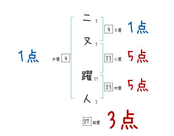 天運![]() | 二又躍人さんの天運は4画の1つ星!感情が不安定で苦労するかも。周囲との協調を心掛けましょう。 家系が持つ宿命的な運勢を表します。祖先から受け継いだ苗字ですので自分の力が及びません。家柄を象徴します。 |
