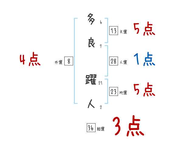 天運![]() | 多良躍人さんの天運は13画の5つ星!才能に恵まれ人気がある。名声を手に入れる。円満な人生。 家系が持つ宿命的な運勢を表します。祖先から受け継いだ苗字ですので自分の力が及びません。家柄を象徴します。 |