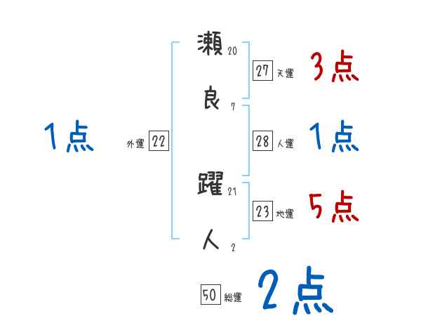 天運![]() | 瀬良躍人さんの天運は27画の3つ星!頭脳明晰だが強情で摩擦が多い傾向。孤立に注意。 家系が持つ宿命的な運勢を表します。祖先から受け継いだ苗字ですので自分の力が及びません。家柄を象徴します。 |