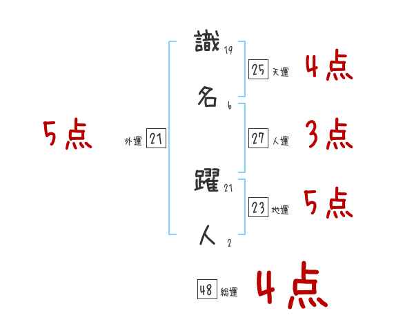 天運![]() | 識名躍人さんの天運は25画の4つ星!個性があり才能があふれる。強運の持ち主で発展する。 家系が持つ宿命的な運勢を表します。祖先から受け継いだ苗字ですので自分の力が及びません。家柄を象徴します。 |