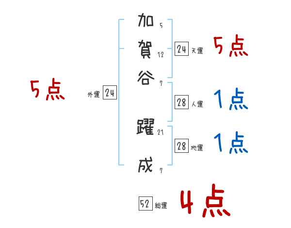 天運![]() | 加賀谷躍成さんの天運は24画の5つ星!家庭運が良く順調な人生。金運にも恵まれる。 家系が持つ宿命的な運勢を表します。祖先から受け継いだ苗字ですので自分の力が及びません。家柄を象徴します。 |