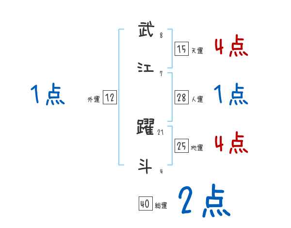 人運![]() | 武江躍斗さんの人運は28画の1つ星!家庭環境に注意。スポーツで活躍できる能力があるかも。 性格や才能などを表す2番目に重要な運勢です。人間関係や協調性、社会的な成功に影響します。主に20歳から50歳ぐらいまでの中年期の運勢を表します。 |