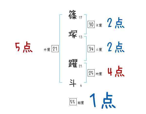 外運![]() | 篠塚躍斗さんの外運は21画の5つ星!統率力がある。独立し成功する。名誉を手に入れる。 生活面を象徴する運勢です。外部から受ける影響力を表し、結婚運、家庭運や職場、環境への順応性を表します。 |