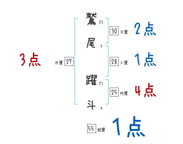 天運![]() | 鷲尾躍斗さんの天運は30画の2つ星!浮き沈みの激しさに注意しましょう。 家系が持つ宿命的な運勢を表します。祖先から受け継いだ苗字ですので自分の力が及びません。家柄を象徴します。 |