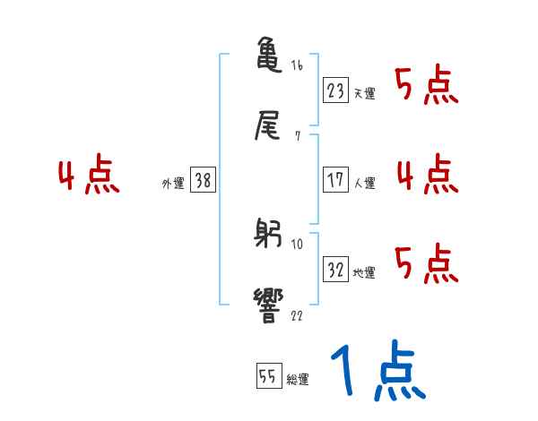 総運![]() | 亀尾躬響さんの総運は55画の1つ星!欲張りな性格で軽率な行動に注意しましょう。病気に気をつけて。 あなたの人生を表す1番重要な運勢です。生涯を通じて影響する総合運となり、主に50歳以降の晩年期に影響を及ぼします。 |