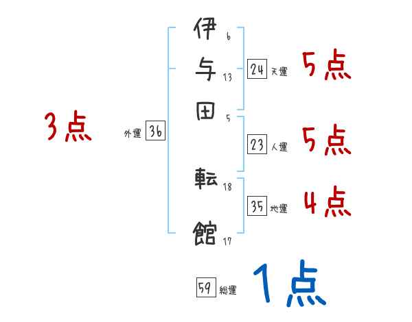 総運![]() | 伊与田転館さんの総運は59画の1つ星!意志の弱さであきらめることが多いかも。粘り強さが必要。 あなたの人生を表す1番重要な運勢です。生涯を通じて影響する総合運となり、主に50歳以降の晩年期に影響を及ぼします。 |