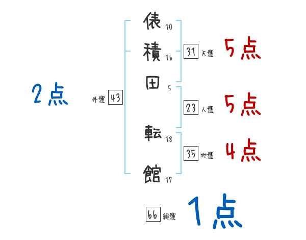 人運![]() | 俵積田転館さんの人運は23画の5つ星!想像力に優れ活力がある。一代で成功し名誉を手に入れる。 性格や才能などを表す2番目に重要な運勢です。人間関係や協調性、社会的な成功に影響します。主に20歳から50歳ぐらいまでの中年期の運勢を表します。 |