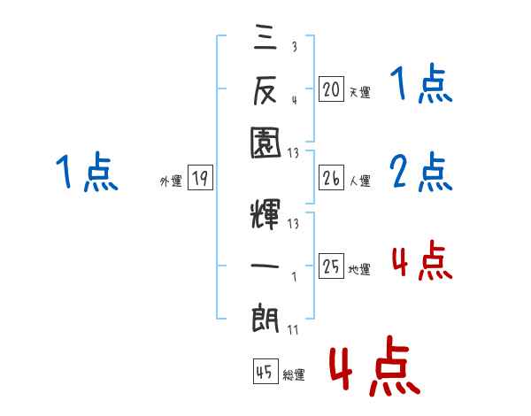 外運![]() | 三反園輝一朗さんの外運は19画の1つ星!優れた才能を持ちますが、協調性が足りないことも。周りの人と協力する事を意識しましょう。 生活面を象徴する運勢です。外部から受ける影響力を表し、結婚運、家庭運や職場、環境への順応性を表します。 |