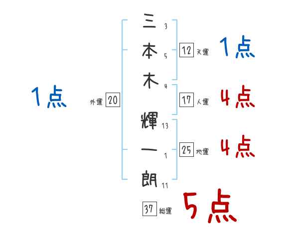 天運![]() | 三本木輝一朗さんの天運は12画の1つ星!簡単な失敗で諦めてしまいやすいかも。着実に行動すると良いでしょう。 家系が持つ宿命的な運勢を表します。祖先から受け継いだ苗字ですので自分の力が及びません。家柄を象徴します。 |