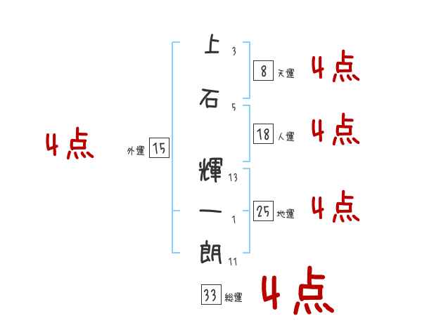 天運![]() | 上石輝一朗さんの天運は8画の4つ星!勤勉家。根気強く努力し成功する。忍耐力がある。 家系が持つ宿命的な運勢を表します。祖先から受け継いだ苗字ですので自分の力が及びません。家柄を象徴します。 |