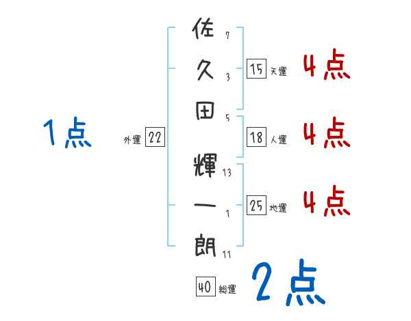 外運![]() | 佐久田輝一朗さんの外運は22画の1つ星!努力することが苦手ないっぽう手先が器用。芸術性にも優れる。 生活面を象徴する運勢です。外部から受ける影響力を表し、結婚運、家庭運や職場、環境への順応性を表します。 |