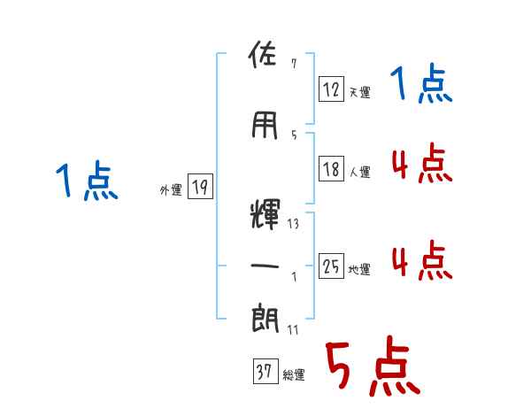 天運![]() | 佐用輝一朗さんの天運は12画の1つ星!簡単な失敗で諦めてしまいやすいかも。着実に行動すると良いでしょう。 家系が持つ宿命的な運勢を表します。祖先から受け継いだ苗字ですので自分の力が及びません。家柄を象徴します。 |