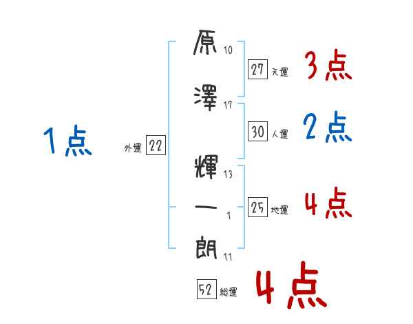 外運![]() | 原澤輝一朗さんの外運は22画の1つ星!努力することが苦手ないっぽう手先が器用。芸術性にも優れる。 生活面を象徴する運勢です。外部から受ける影響力を表し、結婚運、家庭運や職場、環境への順応性を表します。 |