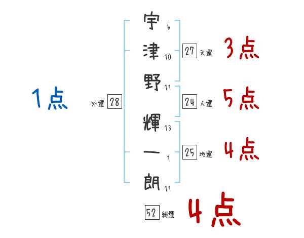 総運![]() | 宇津野輝一朗さんの総運は52画の4つ星!先見性と独創性に優れ考える力がある。強運の持ち主。 あなたの人生を表す1番重要な運勢です。生涯を通じて影響する総合運となり、主に50歳以降の晩年期に影響を及ぼします。 |
