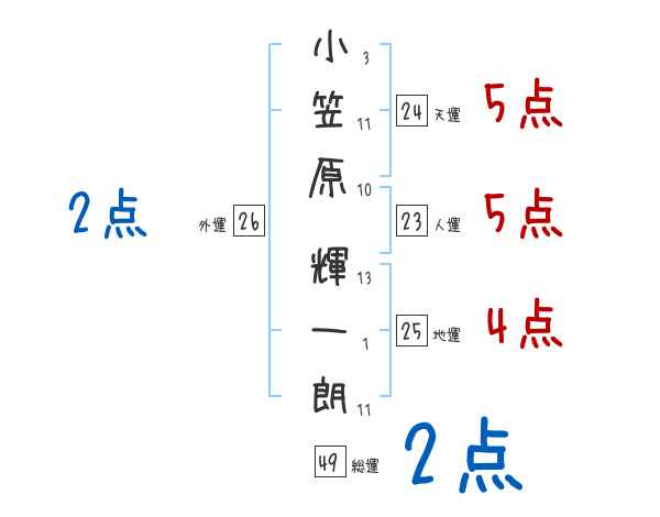 総運![]() | 小笠原輝一朗さんの総運は49画の2つ星!不安定な性格で明暗がある人生。周りの人には支援されやすい。 あなたの人生を表す1番重要な運勢です。生涯を通じて影響する総合運となり、主に50歳以降の晩年期に影響を及ぼします。 |