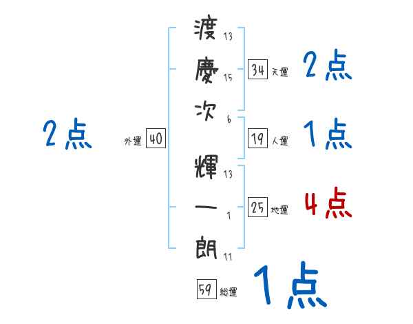天運![]() | 渡慶次輝一朗さんの天運は34画の2つ星!独創性に優れるが、自尊心が強く災難に注意しましょう。 家系が持つ宿命的な運勢を表します。祖先から受け継いだ苗字ですので自分の力が及びません。家柄を象徴します。 |