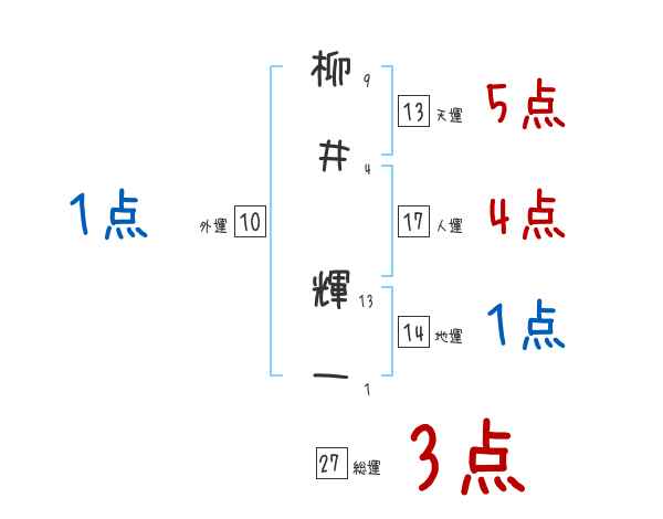 天運![]() | 柳井輝一さんの天運は13画の5つ星!才能に恵まれ人気がある。名声を手に入れる。円満な人生。 家系が持つ宿命的な運勢を表します。祖先から受け継いだ苗字ですので自分の力が及びません。家柄を象徴します。 |