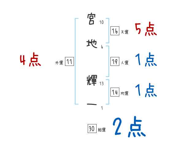総運![]() | 宮地輝一さんの総運は30画の2つ星!浮き沈みの激しさに注意しましょう。 あなたの人生を表す1番重要な運勢です。生涯を通じて影響する総合運となり、主に50歳以降の晩年期に影響を及ぼします。 |