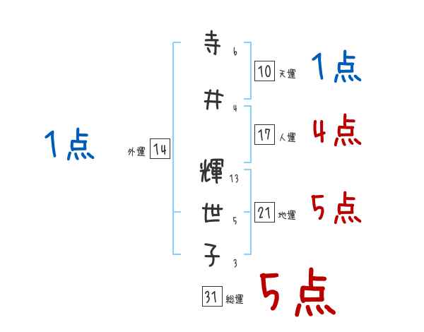 総運![]() | 寺井輝世子さんの総運は31画の5つ星!社交性があり判断力に優れる。順風満帆な人生で円満な生活。 あなたの人生を表す1番重要な運勢です。生涯を通じて影響する総合運となり、主に50歳以降の晩年期に影響を及ぼします。 |