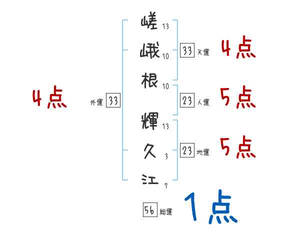 人運![]() | 嵯峨根輝久江さんの人運は23画の5つ星!想像力に優れ活力がある。一代で成功し名誉を手に入れる。 性格や才能などを表す2番目に重要な運勢です。人間関係や協調性、社会的な成功に影響します。主に20歳から50歳ぐらいまでの中年期の運勢を表します。 |