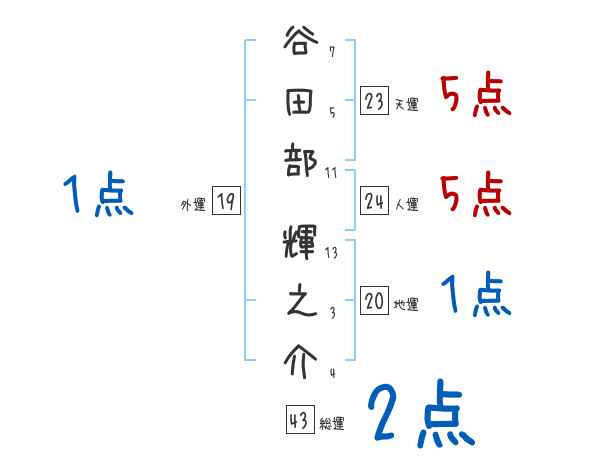 天運![]() | 谷田部輝之介さんの天運は23画の5つ星!想像力に優れ活力がある。一代で成功し名誉を手に入れる。 家系が持つ宿命的な運勢を表します。祖先から受け継いだ苗字ですので自分の力が及びません。家柄を象徴します。 |