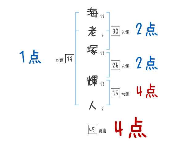総運![]() | 海老塚輝人さんの総運は45画の4つ星!もくもくと物事を進め達成する。地味な努力家。 あなたの人生を表す1番重要な運勢です。生涯を通じて影響する総合運となり、主に50歳以降の晩年期に影響を及ぼします。 |