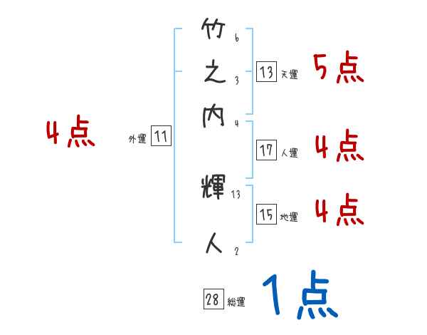 総運![]() | 竹之内輝人さんの総運は28画の1つ星!家庭環境に注意。スポーツで活躍できる能力があるかも。 あなたの人生を表す1番重要な運勢です。生涯を通じて影響する総合運となり、主に50歳以降の晩年期に影響を及ぼします。 |